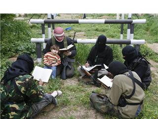 في أحد المنتديات الإسلامية على شبكة الإنترنت، يعرض أحد المتدخلين صورة لمن يزعم أنهم “مجاهدو” “فتح الإسلام” في لبنان. خمسة رجال ملثمين يقرؤون القرآن. الرجل في صدر الصورة، منهمك بدوره في القراءة. بيسراه، يحمل القرآن ويسند سلاحه. بيمناه، يشد إليه طفلا صغيرا يحدق بالمصور وعدسته على ما يظهر، وتبدو على وجهه الصغير معالم الدهشة والفضول.