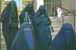وربّما كانت هذه الصورة أو نظائرها مألوفة في مدن كثيرة، عربيّة وإسلاميّة أو غيرهما: لفيف من النسوة المتشحات بسواد العباءة (نقاب أو حجاب أو تشادور . . . ومشتقاتها) لا يرى منهنّ شيء عدا القليل من العيون، ينزلن من درج إحدى البنايات (لعلّها إحدى المؤسسات العموميّة) في مدينة ما. وفي أعلى الصورة، على اليمين، رجل أمن بزيّه الرسميّ. صورة تجمع المرأة “المسلمة” (على مذهب من المذاهب ليس من المهم تحديده) والشرطيّ “حارس المدينة” وبينهما حاجز أحمر.