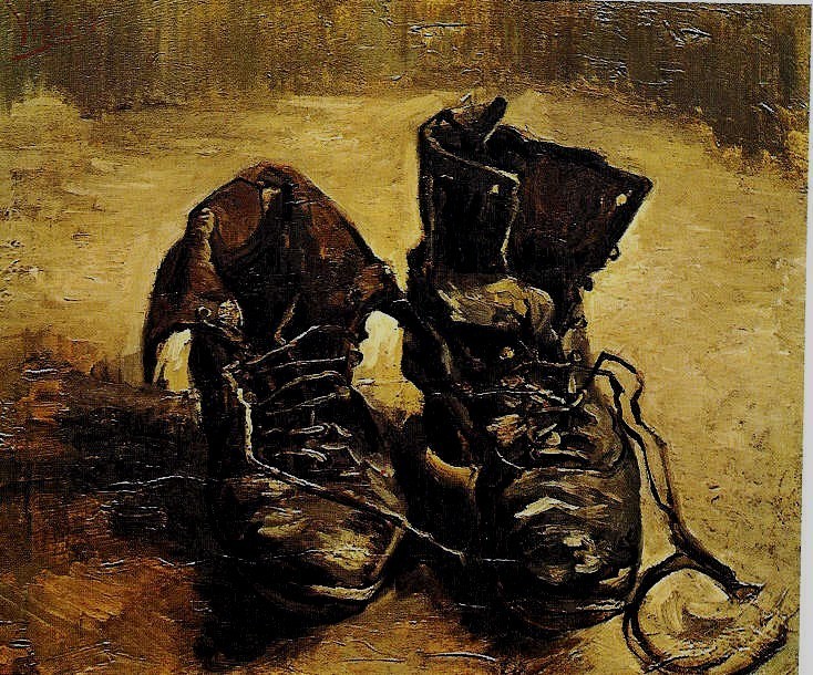تحملنا عودة المداس في الحكاية أو الأحذية في الرّسم إلى إعادة التّفكير في منطق هذه العودة نفسها. فهي محكومة بمنطق آخر غير منطق القطيعة. فالنّصائح لا تقطع أبدا، وإنّما يخفّ شدّها في المداس أو في الأحذية بما يمكّن القدمين من الدّخول فالخروج، أو من الخروج فالعودة. فالمداس أو الأحذية تشبه السّيور الّتي تلتفّ أو تتراخى بالقدمين، فتضحي بنيتها مثل قبضة أو ضمّة أو شدّة، أو مثل شكل مبنيّ قريب ممّا يسمّيه دريدا بلفظ « stricture » يضمّ الجوّانيّ والبرّانيّ والأعلى والأسفل. فمداس الطّنبوريّ شأنه شأن أحذية فان غوغ ليس ملتفّا بالقدمين وليس مخلوعا، وليس ممتلئا بهما ولا فارغا. فلقبضة « stricture » المداس والأحذية بنية الإكراه المزدوج double bind ، بحيث يكون الأسفل منشدّا إلى الأعلى، وفي الآن نفسه يكون الجوّانيّ قد ضمّ إليه البرّاني. ولعلّ هذه البنية هي الّتي تجعل كلّ الأشياء الّتي تنفصل عن أصحابها تعود إليهم بتجديد النّسبة والتّعرّف إلى ملكيّة تعرّفا يذكّر بتلك الممارسة الّتي كانت تقوم على الرّمز حين يلتقي المنفصلان: الشيء ومالكه أو الشيء ونسبته، فالمداس كالأحذية يحتفظ بالاسم، أمّا المسمّى (الطّنبوريّ أو فان غوغ) فيحتفظ بالشّيء. والسؤال ليس لمن هذا المداس أو الأحذية، وإنّما لمن هي القدمان اللّتان كانتا في ذلك المداس أو تلك الأحذية؟ تجيب كلّ حكاية بأسلوب مختلف. فإن كان الحذاء في حكاية سندرلاّ على اختلاف صيغها قد عُرف بالقدم فإنّه في حكاية الطّنبوريّ قد عرف بالشّخص. فالمداس في الحكاية عُرف بالشّخص لا بالقدم؟ فالقدمان تمثّلان الشّخص وتستحضرانه. ولعلّ في ذلك ما يفسّر بأنّ الأشياء، في نظامها القديم على الأقلّ، لم تكن منفصلة عن أصحابها، فلم تكن تنسب إلى من يستعملها، بل إلى من يمتلكها.